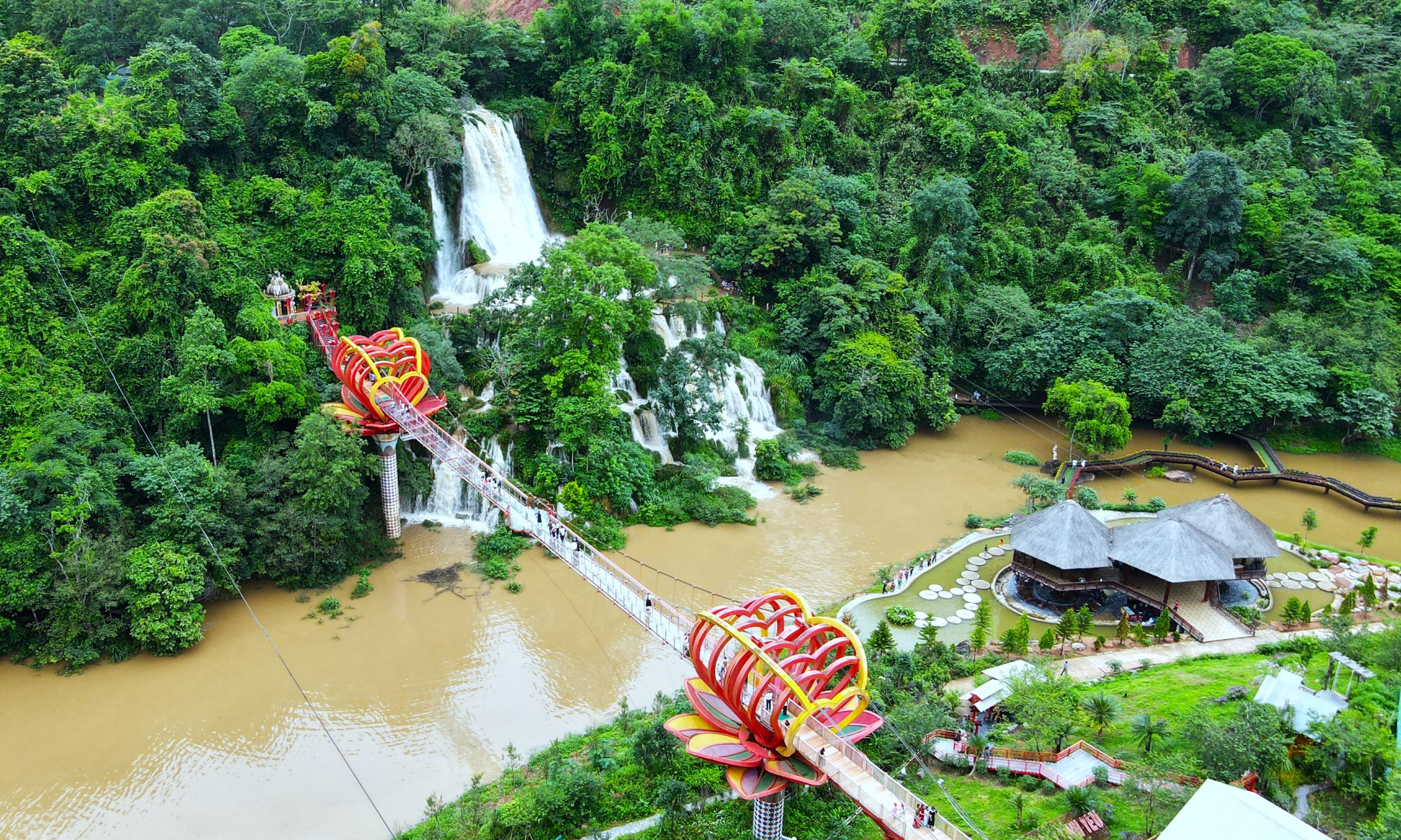 - Điểm nổi bật: Thác Dải Yếm cao hơn 100m, chảy xuống từ các dãy núi tạo thành một dòng nước trắng xóa như chiếc dải yếm lụa vắt ngang núi rừng. Đây là nơi lý tưởng để ngắm cảnh và tận hưởng không khí trong lành.